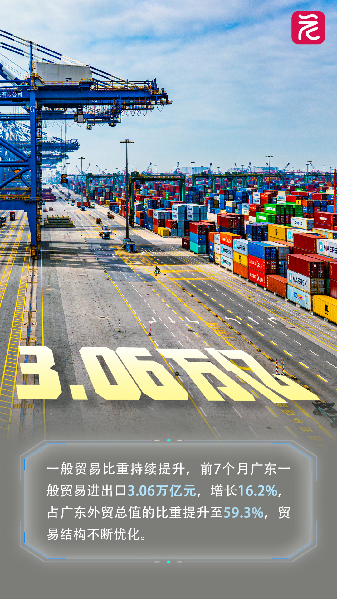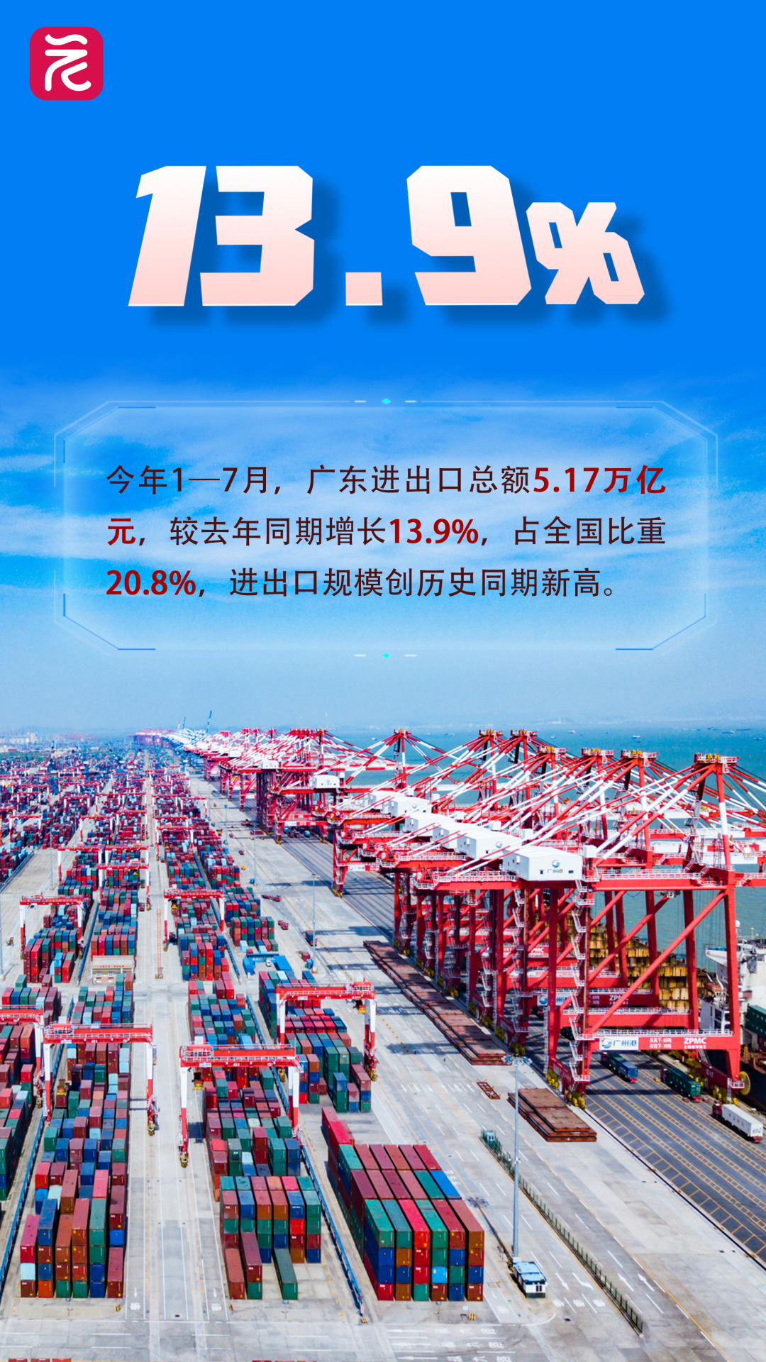 海关总署广东分署最新公布的数据显示,今年1—7月,广东进出口总额5.17万亿元,较去年同期增长13.9%,占全国比重20.8%,规模再创历史同期新高。