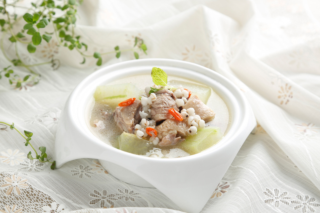 点评:消暑,祛湿,健脾。炒薏米与陈皮的加入让汤既消暑祛湿、平补脾肾,又不会过于寒凉。
