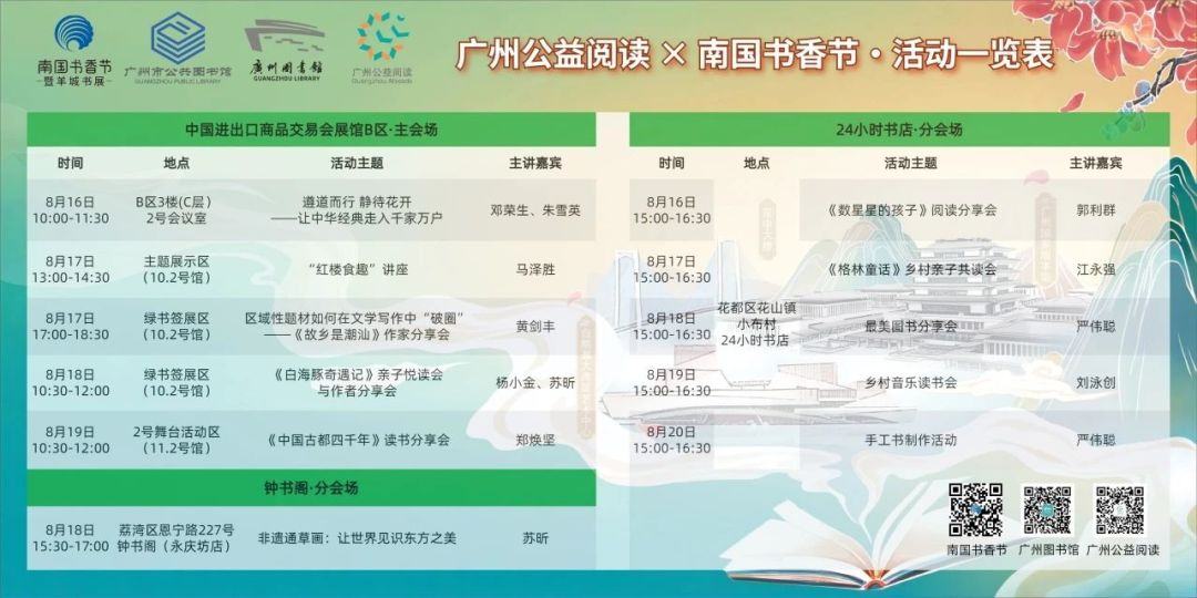 此外,广州图书馆·广州公益阅读将在主会场、24小时书店分会场、钟书阁分会场等地精心打造11场阅读盛宴。11场广州公益阅读活动等你来!详情>>>