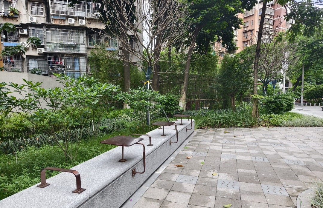 根据口袋公园小巧、灵活、便捷的特点,微改造拆除该路段绿化围蔽的铁护栏,保留原有乔木,重新搭配高低错落的灌木和草坪,扩大开放共享绿色空间;同时铺设一条贯穿西华路到驷马涌绿道的人行道,解决社区居民多年诉求的人车混道安全问题;配合社区不同人群的使用需求,设置休闲座椅、健身路径,链接驷马涌碧道,形成连贯的绿道网络,为居民提供更多的活动空间。改造后的口袋公园,满足了居民运动、交往、园艺等娱乐休憩的功能需求,还为居民提供了一个庆祝节日、文化交流的活动阵地。