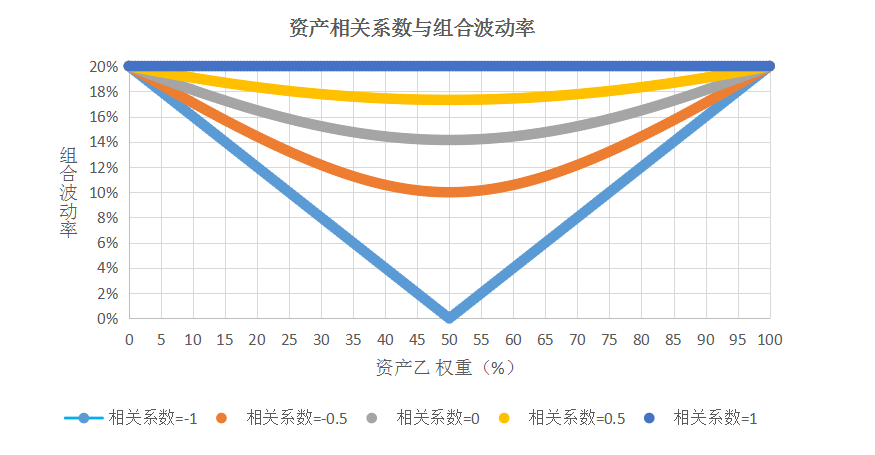 当甲乙资产相关系数为-1,配置50%资产乙,就能把组合波动率降至0,当然,这种完美负相关的资产,在投资实践中非常少见。