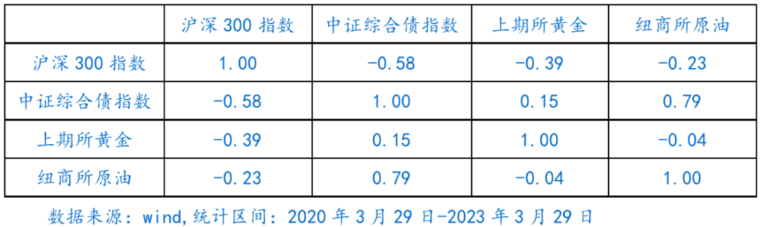 例如,下表为最近三年不同资产之间相关系数,可以看到沪深300指数走势与国内债券、黄金、国际油价走势之间相关系数为负,均为负相关;而黄金与其他几类资产之间相关系数较低或负相关。