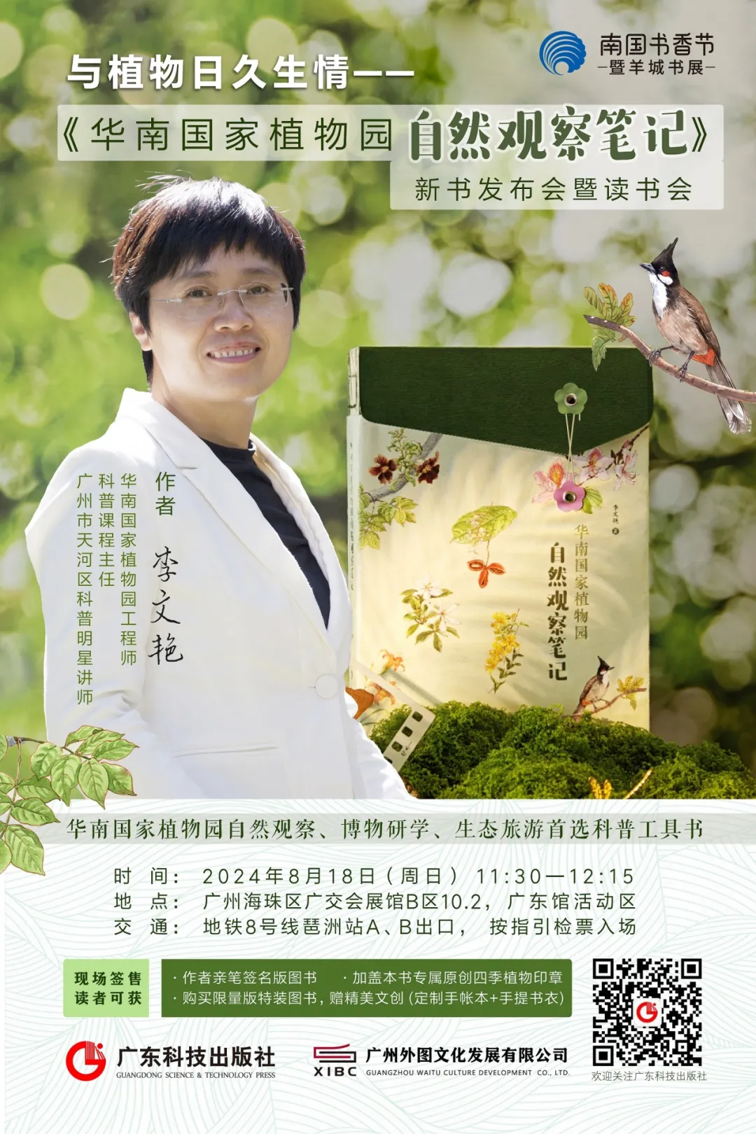 8月18日(周日)上午11:30-12:15,在广交会展馆B区10.2广东馆活动区,该书作者、华南国家植物园工程师、科普课程主任李文艳老师将邀你赴一场浪漫植物之约:与植物日久生情——《华南国家植物园自然观察笔记》新书发布会暨读书会。本活动由广东科技出版社有限公司和广州外图文化发展有限公司共同举办。