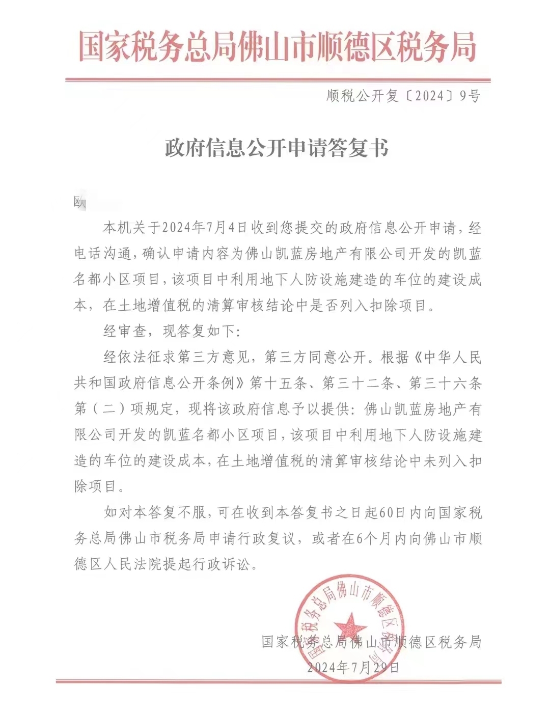 记者从有关渠道了解到,7月29日,国家税务总局佛山市顺德区税务局答复凯蓝名都业主欧阳先生的一份《政府信息公开申请答复书》中称,佛山凯蓝房地产有限公司开发的凯蓝名都小区项目,该项目中利用地下人防设施建造的车位的建设成本,在土地增值税的清算审核结论中未列入扣除项目。