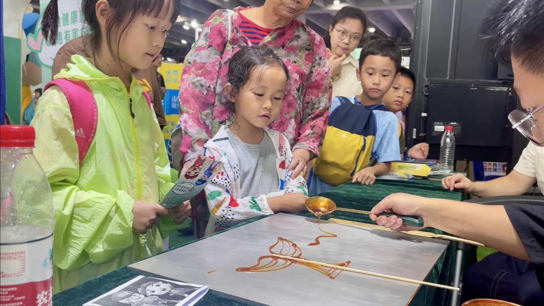 “我是被清风侠和猪猪侠吸引进来的,第一次见到它们的‘真人’,我觉得很兴奋!”准备上四年级的小凯玲来自环市路小学,平时就喜欢看卡通和动漫作品。她告诉记者,在羊城书展的特色展区,不少卡通人物形象都让她感到亲切而熟悉。在糖画表演区也聚集了众多家长和孩子,他们都在耐心等待广州市非遗糖画传承人到现场表演糖画绘制。无论是“清风侠”“猪猪侠”“版仔”,还是家长手机相册中可爱的“定制”图案,每一个拿到糖画的孩子脸上都露出了满意的笑容。