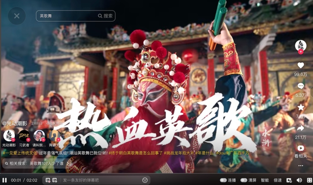 @光动潮影是一位来自潮汕地区的文旅创作者,今年以来,他以潮汕传统文化为主题,通过创意手法,制作了包括英歌舞、潮汕民居、广东凉茶等众多爆款短视频,作品总播放量突破8000万。
