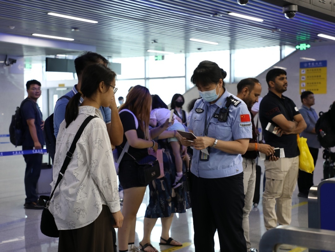 针对暑期团队旅客较多的特点,为避免团队人员统一进入查验大厅造成拥堵,该边检站在候检区域派专人引导分流旅客,必要时在大厅边位加开“专门通道”,引导团队人员至“专门通道”排队办理出入境手续,同时加强与口岸联检单位沟通协调,全力保障出入境旅客安全顺畅高效通关。