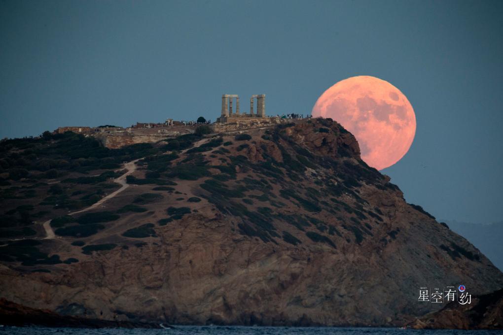 2023年8月30日,“超级月亮”从希腊苏尼翁角的波塞冬庙上空升起。新华社发(马里奥斯·罗洛斯摄)