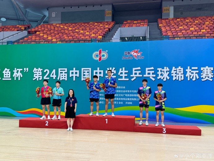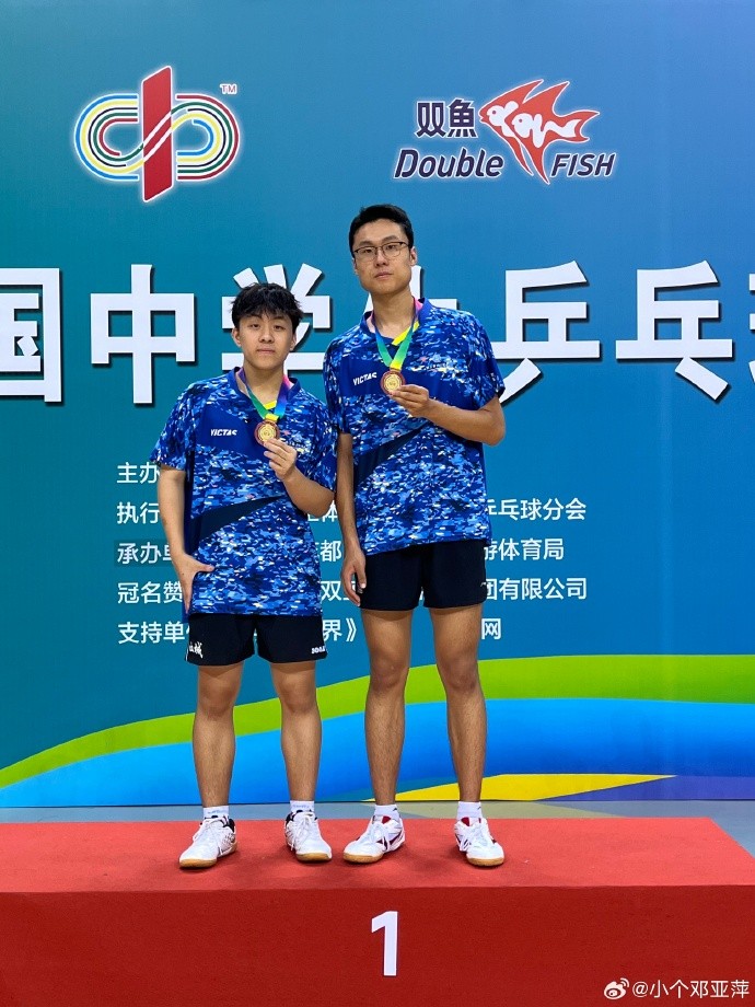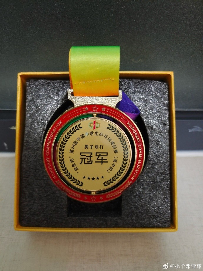 从晒出的奖牌可知,林瀚铭获得双鱼杯·第24届中国中学生乒乓球锦标赛(高中组)男子双打冠军。