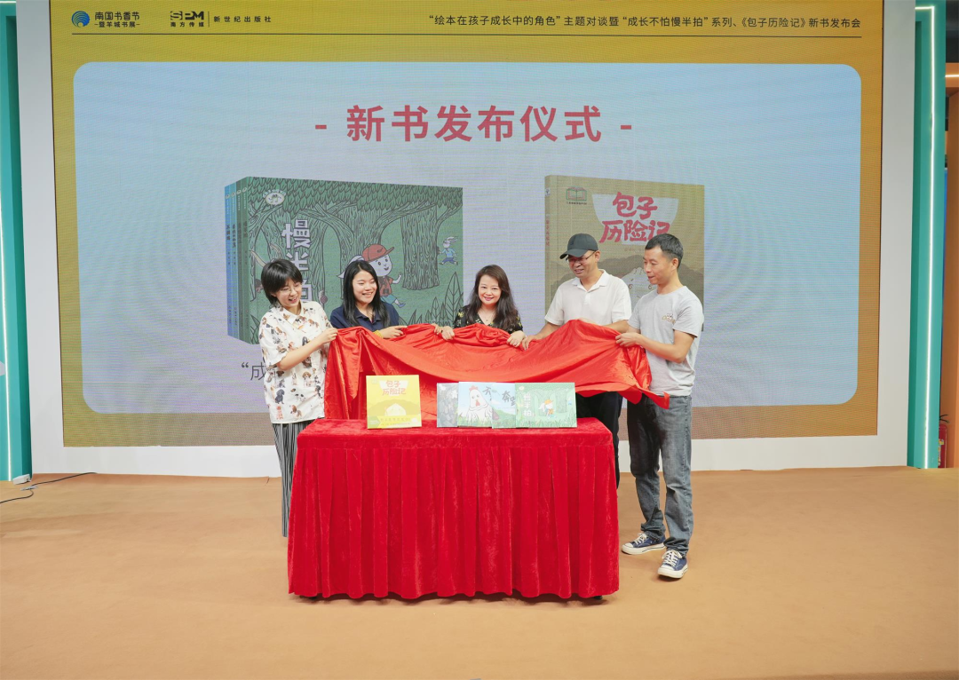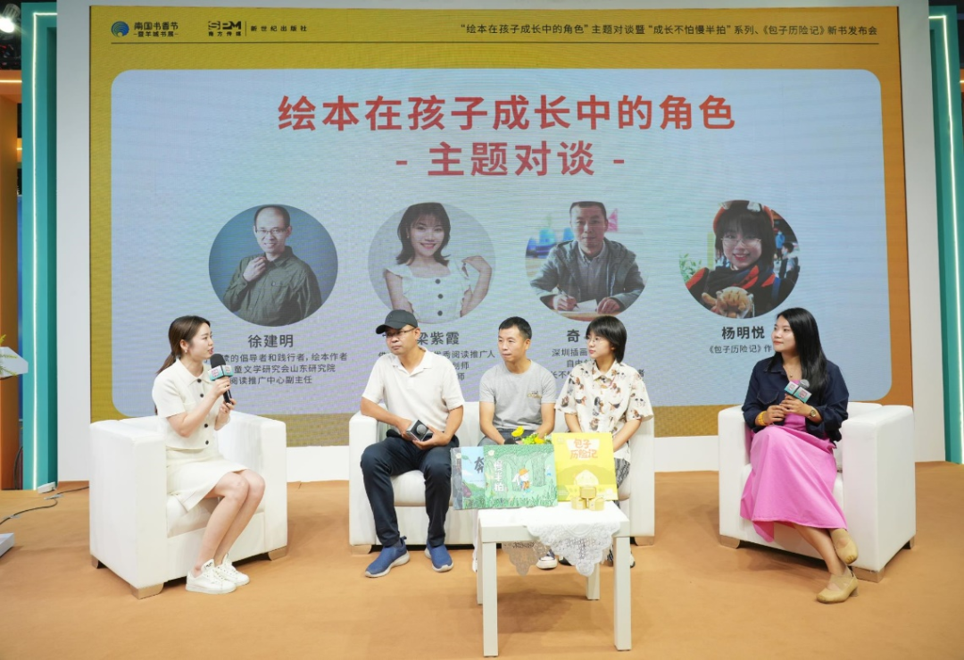 8月17日下午,南国书香节广东馆迎来了一场特别的活动——“绘本在孩子成长中的角色”主题对谈暨“成长不怕慢半拍”系列、《包子历险记》新书发布活动举行。新世纪出版社总编辑翁容,中国儿童文学研究会山东研究院阅读推广中心副主任徐建明,南海区优秀阅读推广人、家庭教育讲师梁紫霞, “成长不怕慢半拍”系列作者奇伟,《包子历险记》作者杨明悦共同探讨绘本在儿童成长中的重要性。