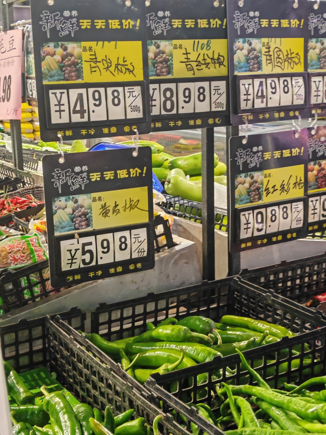 上海青苗4.58元一斤,黄皮椒5.98元一斤,西红柿5.58元一斤……临近中午,广州市一家生鲜超市内,熙熙攘攘的市民正在挑选合适的菜品。独自采购的王女士表示,最近的蔬菜价格比以往贵了不少,部分菜品质量甚至不如从前,特别是自己心仪的彩椒一类。