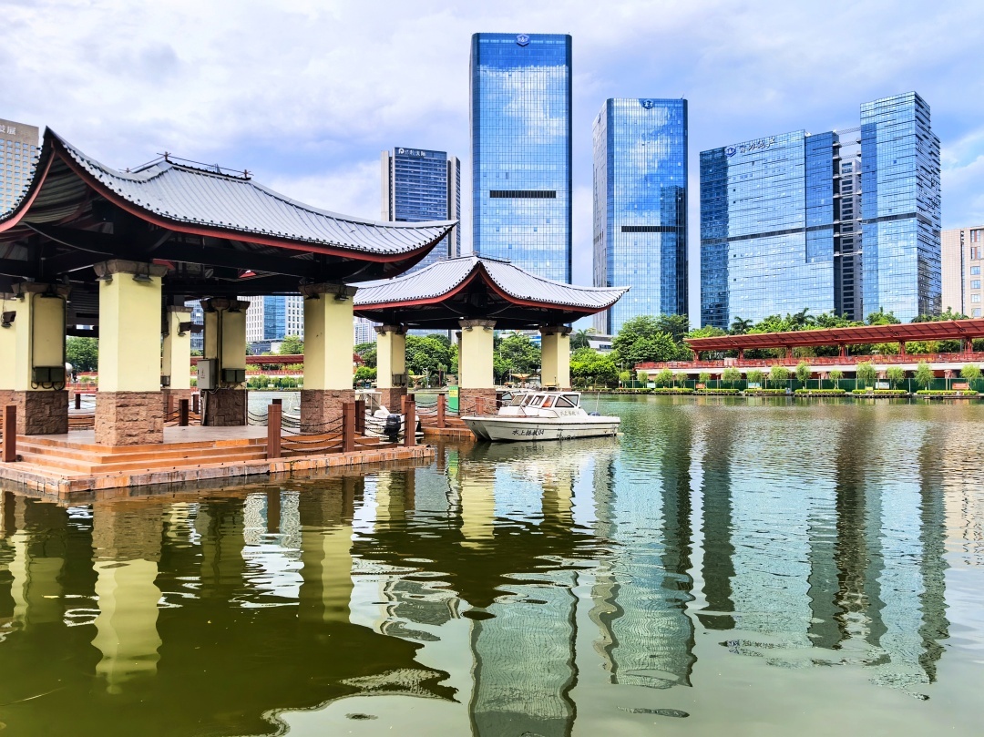 回溯至2002年,千灯湖公园一期落成并对外开放,以其独特的水系景观和开放式的管理模式,成为市民休闲娱乐的首选之地,千灯湖公园步入以城为主的“1.0”阶段。然而,千灯湖的故事远不止于此。随着广东金融高新区的挂牌成立(2007年)及后续发展,千灯湖逐渐吸引了全球的目光。2015年,千灯湖公园荣获全球城市开放大奖,这一殊荣不仅是对其规划与设计的高度认可,也预示着其国际影响力的显著提升。进入新时代,千灯湖的发展步伐进一步加快。2018年,政府工作报告中首次提出灯湖中轴北延的宏伟蓝图;2019年,千灯湖四期全面建成,为这片区域注入了新的活力与动能。至此,千灯湖已不再是单一的市政公园,而是逐步成长为以公园为核心,集经济、文化、生活、休闲于一体的中央商务区,千灯湖也迈入了以“城产结合”为主的2.0阶段。
