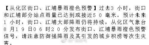 过去3小时,街口和江埔部分站点雨量已达到或接近50毫米。预计未来1小时,街口、江埔大部降雨仍将持续,从化区气象台8月19日06时20分发布街口、江埔暴雨橙色预警信号,请注意防御强降雨及其引发的城乡积涝等次生灾害。