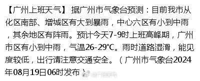 据广州市气象台预测:目前广州市从化区南部、增城区有大到暴雨,中心六区有小到中雨,其余地区有阵雨。预计今天7-9时上班高峰期,广州市区有小到中雨,气温26-29℃。雨时道路湿滑,能见度较低,出行请注意交通安全。