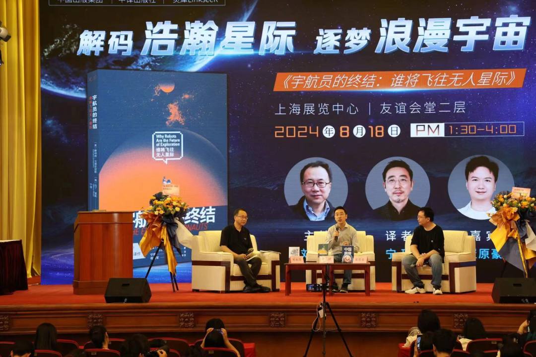 8月18日下午,由中国出版集团中译出版社主办的“解码浩瀚星际,逐梦浪漫宇宙”——《宇航员的终结:谁将飞往无人星际》新书签售会在上海书展上海展览中心举办,数百名读者齐聚活动现场。活动由中译出版社总编辑刘永淳主持,演员及本书译者宁理、南方科技大学副研究员崔原豪参与对谈,中译出版社副总经理杨光捷出席活动。
