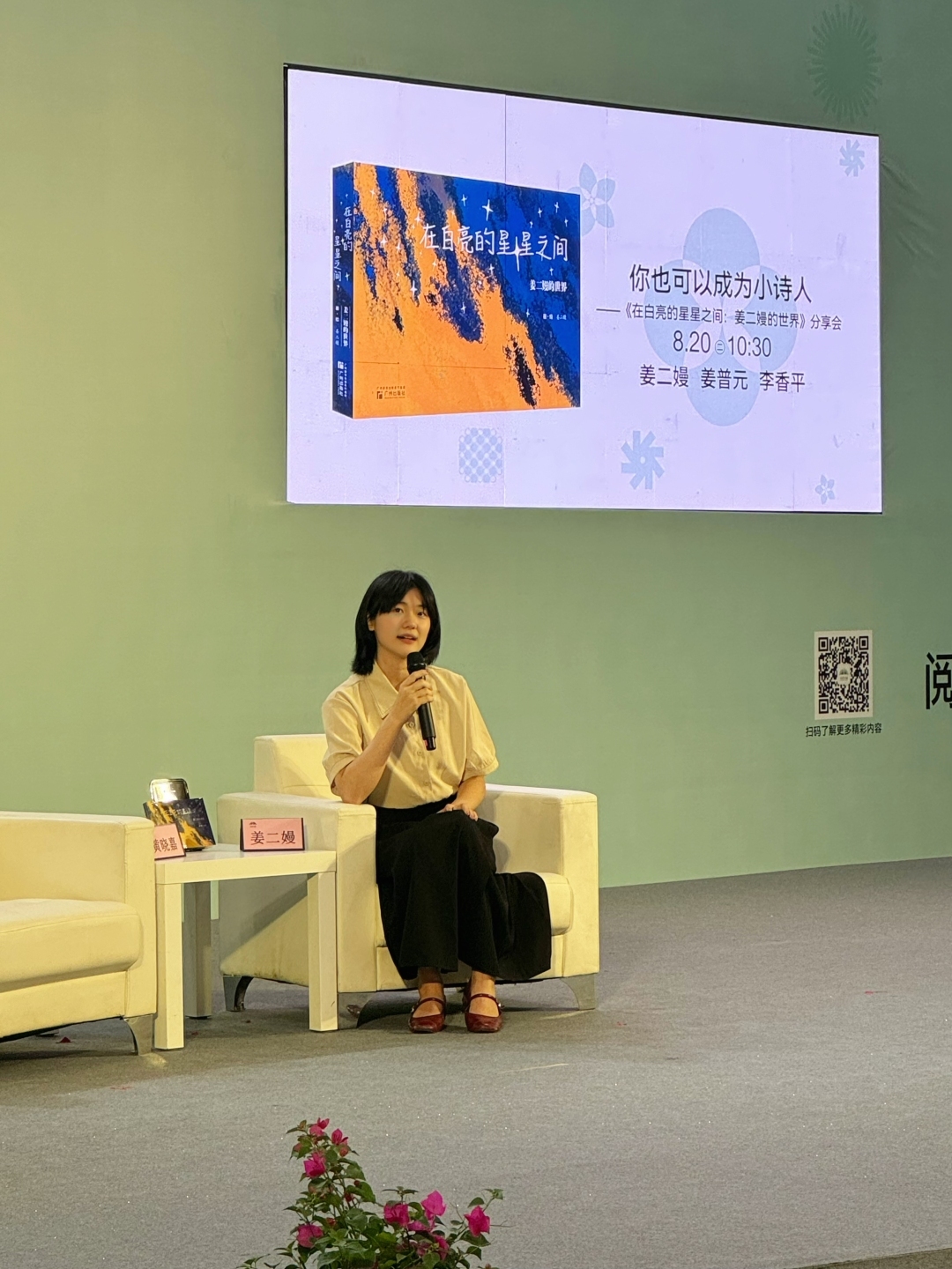 诗韵羊城,幸福广州。8月20日上午,2024南国书香节暨羊城书展活动之《在白亮的星星之间:姜二嫚的世界》分享会在羊城书展主会场举行,05后诗人姜二嫚及其父亲姜晋元、知名家庭教育研究专家李香平老师等嘉宾为观众带来了一场精彩的分享。