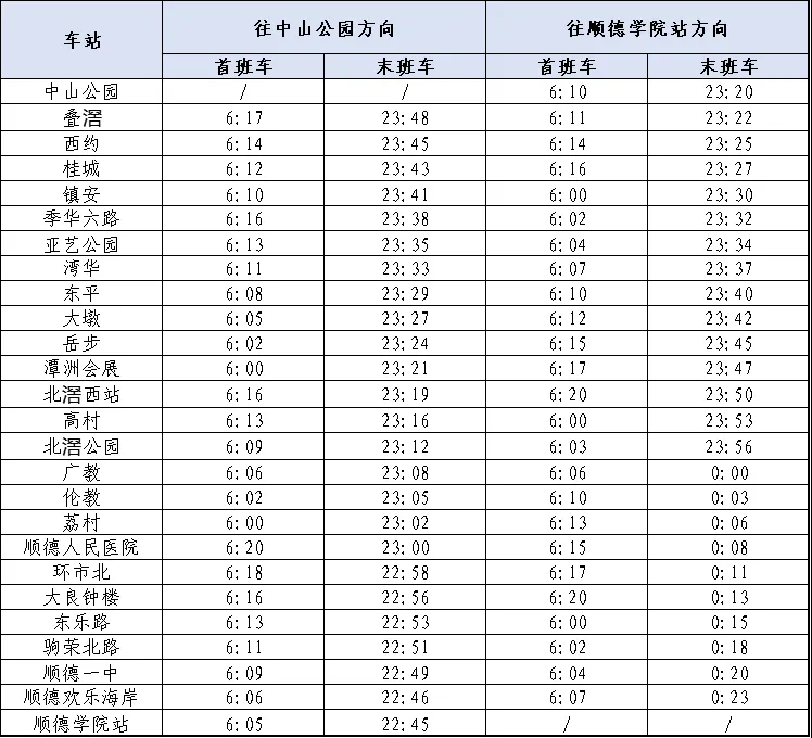 在行车间隔及运营服务时间方面,8月23日起,佛山地铁3号线运营服务时间对比当前首通段的运营服务时间会有所调整。其中,“顺德学院站-中山公园站”单程为62分钟,高峰、平峰、低峰行车间隔分别为5分39秒、8分29秒、9分30秒;“联和站-佛山大学站”单程为21分钟,全天行车间隔为9分钟。