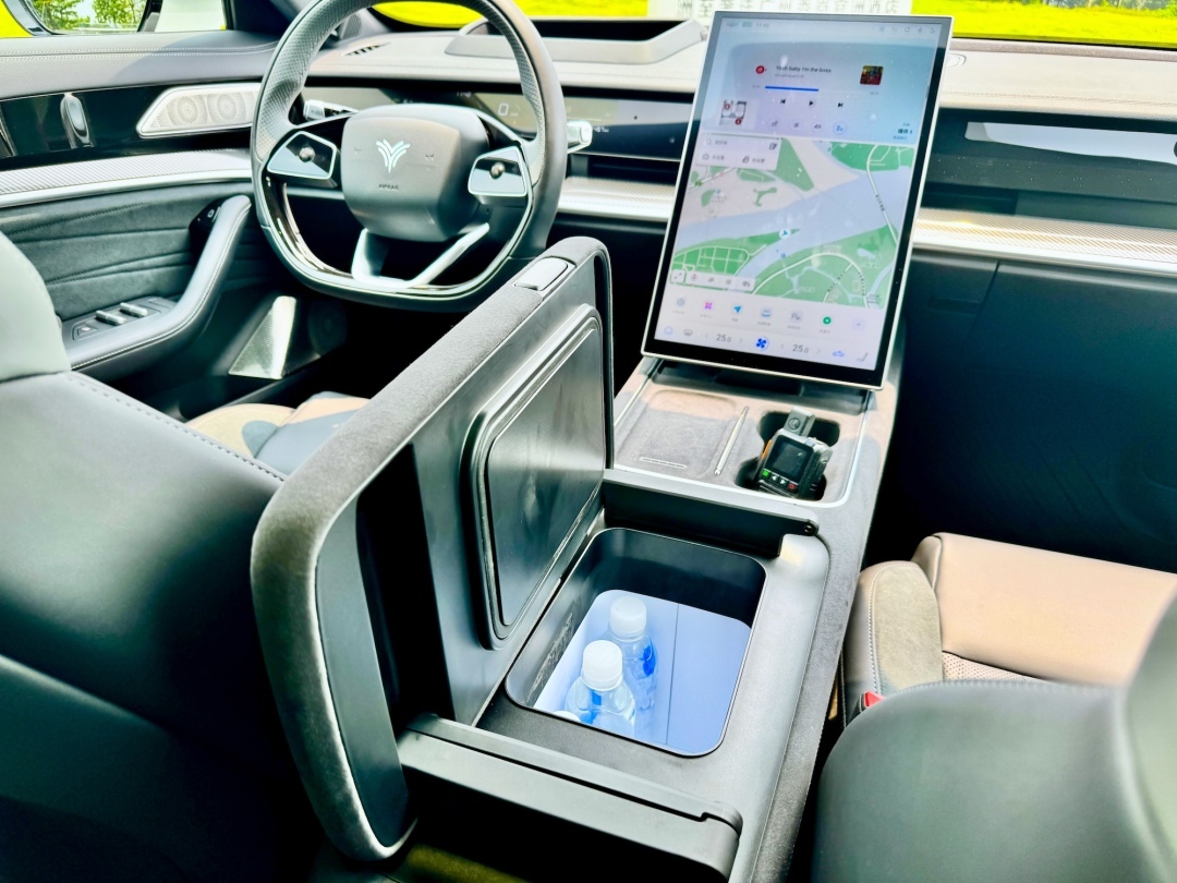 哪吒S猎装的“冰箱彩电大沙发”也是“肉眼可见”。6.5L的“冰箱”被安排在前排扶手箱,一目了然,可以放入6瓶350ml左右的小瓶饮料。全新前排加热、通风、按摩座椅和头枕音响,对标一线豪华配置。