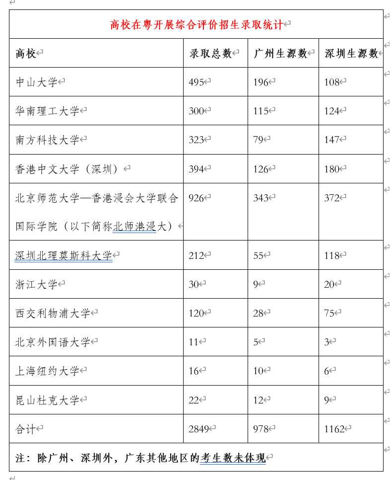 记者梳理发现,11所高校今年开展综合评价招生共录取2849人,其中,北京师范大学—香港浸会大学联合国际学院、中山大学、香港中文大学(深圳)、南方科技大学、华南理工大学等最终的录取总数占据前五位,分别为926人、495人、394人、323人、300人。