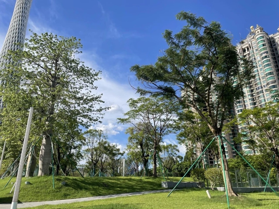 承建单位广州一建介绍,项目位于广州塔旁,建设过程中避免“声、光、尘、土”扰民尤为重要,通过安装扬尘喷雾系统、绿植围墙、裸土全覆盖绿网、全覆盖式钢结构降噪棚、噪音扬尘监测仪,有效减少扬尘和噪音对外界的影响。首创的大跨度异形索网天幕绿色施工技术,不仅美观防尘,而且经鉴定达到国内领先水平。
