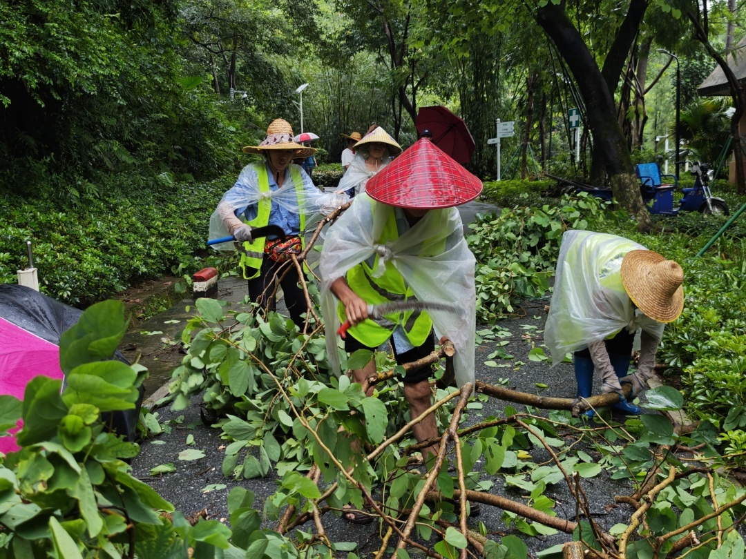 当日下午,白云永泰乒乓体育公园内发生多处险情,公园工作人员紧急处理,及时疏散游客16位;针对白云山水大量涌入公园,造成园内池塘水位暴涨以及多处积水,公园工作人员紧急打开池塘泄水闸口,揭起12个排水口沙井盖,加强排水;还召集10名绿化工作人员对一株直径30厘米的倒伏园路中的紫荆进行清障清理,确保安全。