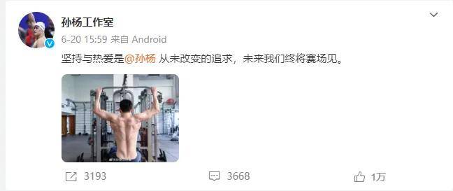 今年5月28日,孙杨为期4年零3个月的禁赛正式结束。当天,孙杨工作室就发文表示:“超越自我,泳者无畏”。随后的6月20日,工作室晒出了孙杨进行力量训练的照片,并配文“坚持与热爱是孙杨从未改变的追求,未来我们终将赛场见。”