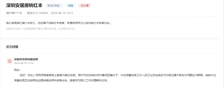 深圳市住房和建设局回复相关市民称,当前市住房建设局正在按照法定程序推进相关政策出台。