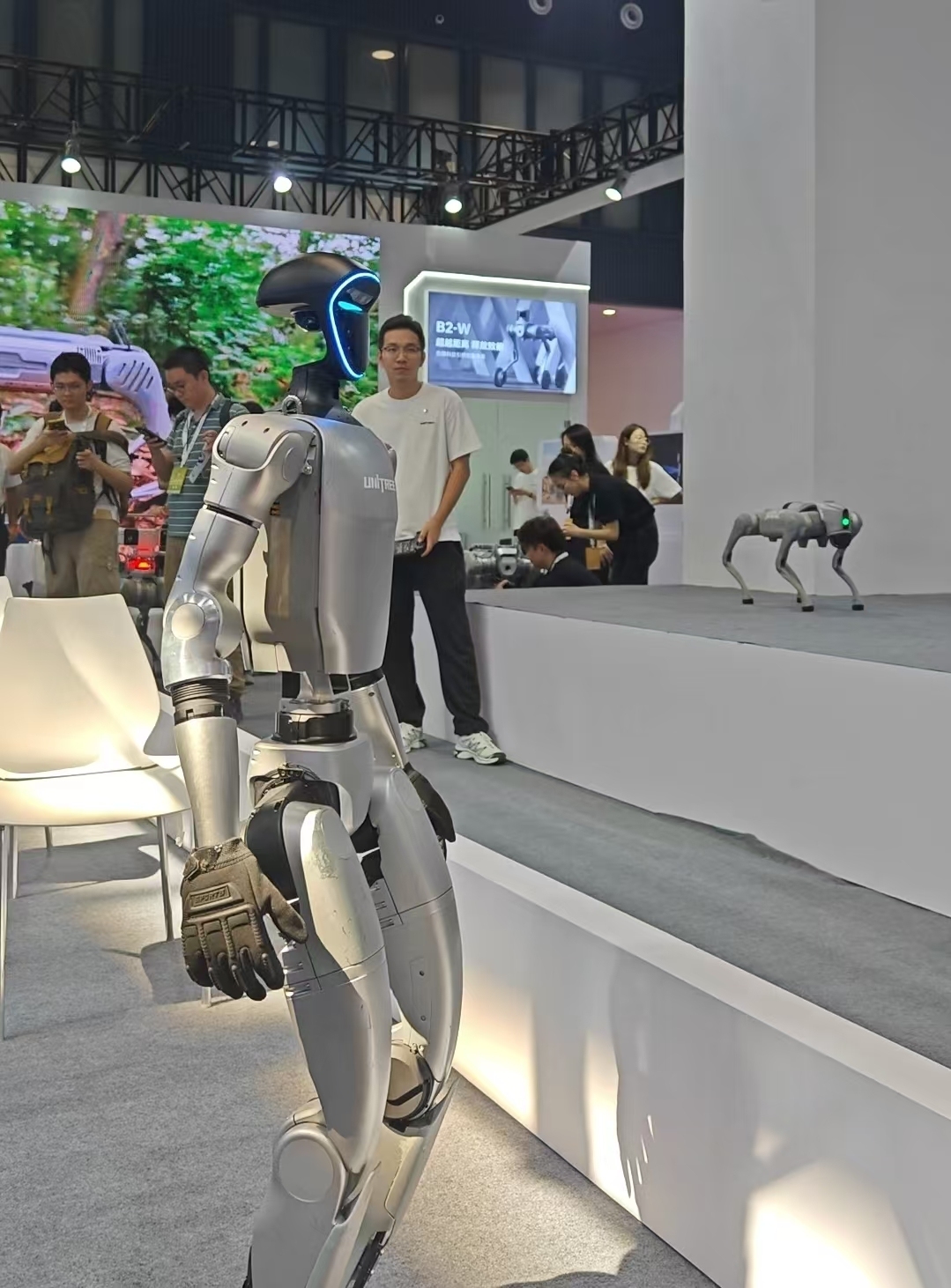 持续专注于行业应用的宇树一直处于先行者地位,特别是在电力巡检、消防救援等领域。现场展示的B2-W轮足机器人,像B2四足机器人一样专为行业应用而设计,具备出色的负载能力和极致的稳定性。它可以执行多项任务,如爬楼梯、跨越障碍物、越野、倒立等,并且具备持续负载和自主导航功能。