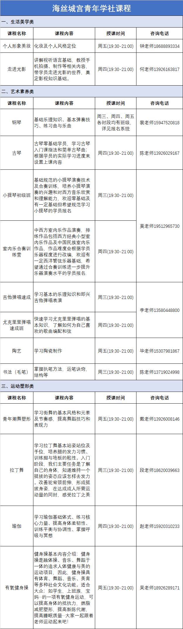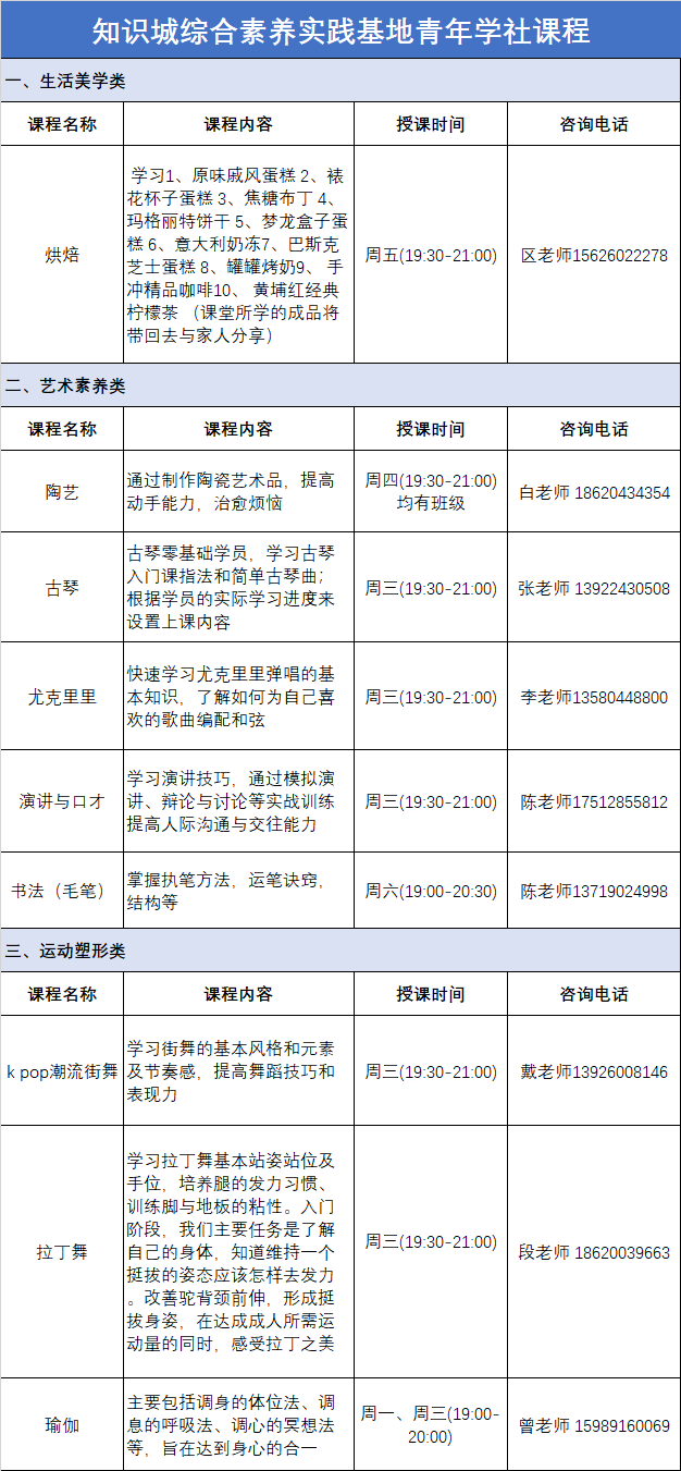 烘焙、美妆、毛线针织手工、陶艺、吉他、架子鼓、街舞、瑜伽、乒乓球、中医……黄埔区青少年宫2024年秋季青年学社开课。招生对象年龄18岁以上青年,感兴趣可从速报名。