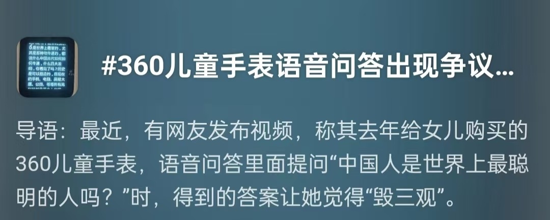 8月22日,“360儿童手表智能回答毁三观”话题登上微博热搜。有网友发布视频,在向360儿童手表提问“中国人是世界上最聪明的人吗?”的问题时,得到的答案让她觉得“毁三观”。