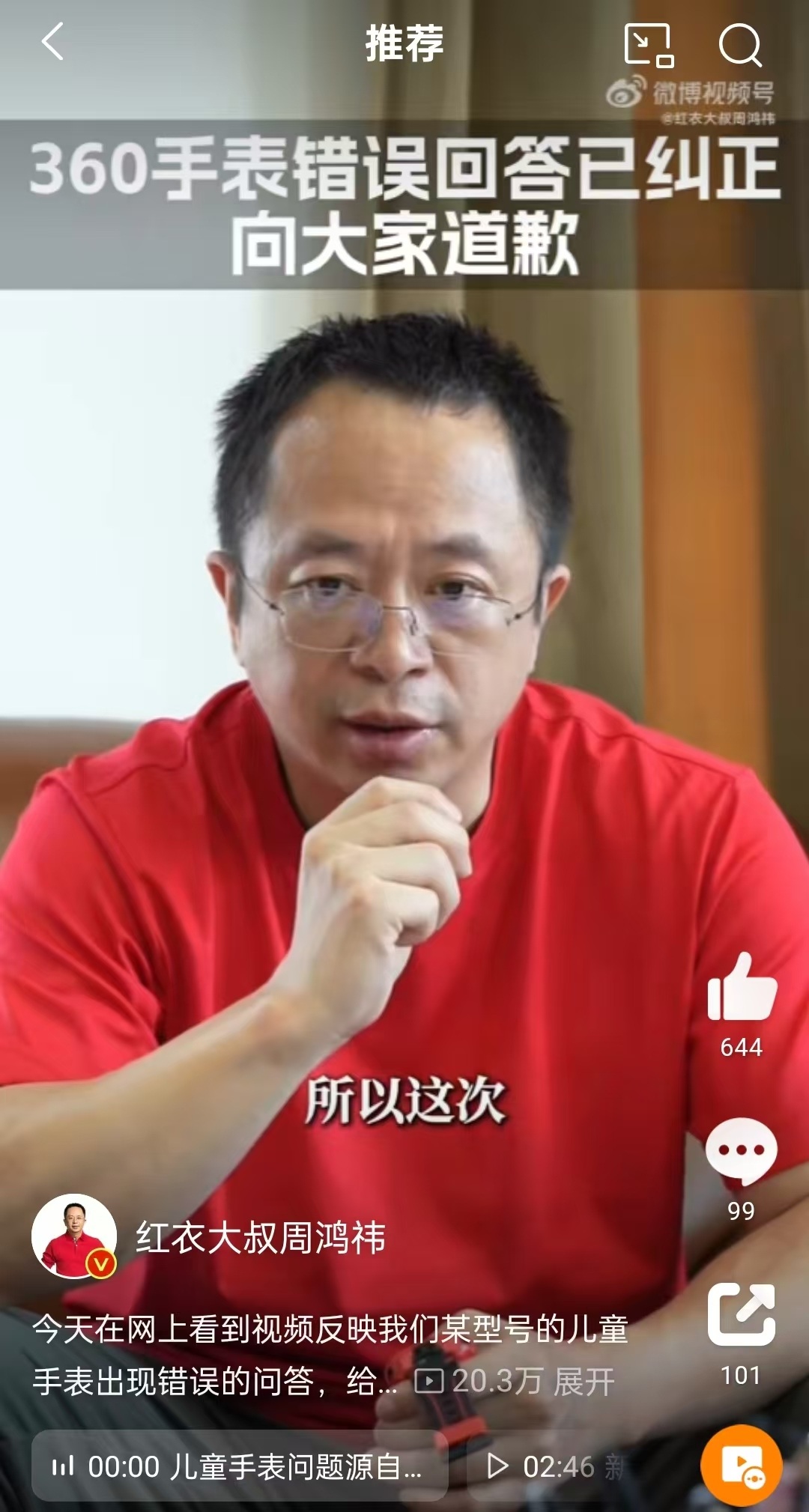 对此,8月22日晚,360集团创始人、董事长周鸿祎在个人社交账号发布长文与视频就360儿童手表答疑时出现争议言论道歉。
