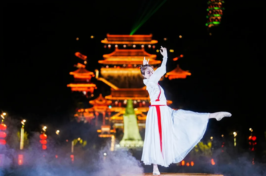 在梦幻大气的氛围中,舞蹈演员翩翩起舞,在夜间天后广场及宫殿群的背景映衬下,形成一幅美轮美奂的画卷。