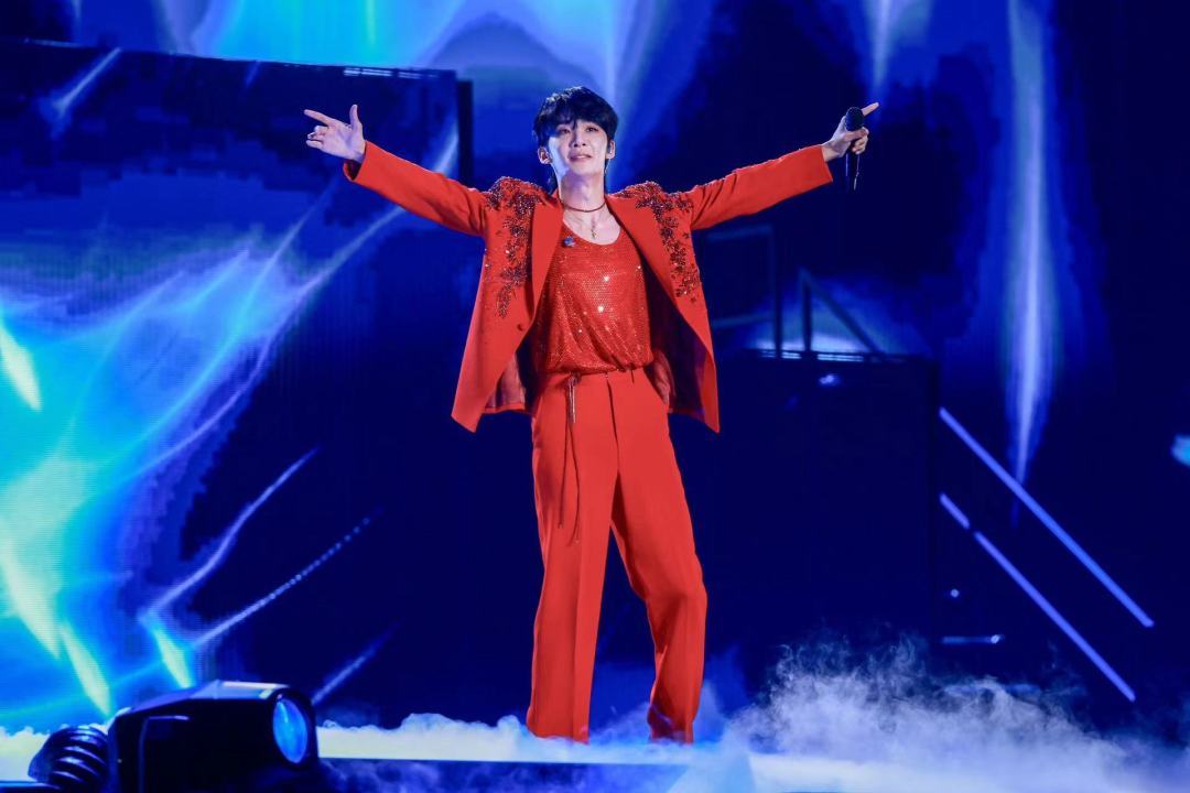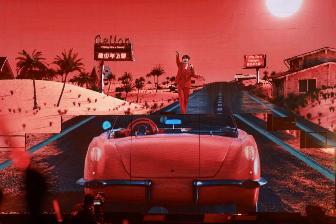 本场演出依旧以一曲复古轻摇滚风的《秒针》拉开序幕,一身红色西装的王赫野一开嗓瞬间就把现场的气氛点燃。相较上海站,广州站对舞台、灯光等都进行了全面升级,现场视觉效果更加绚丽震撼。开场的彩虹色幕帘、头顶及舞台两侧的巨型“风扇”装置、随着音乐歌曲不断变幻的舞台场景等都让不少歌迷直呼“美哭了”!
