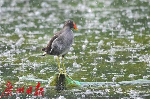 中午时分,广州起义烈士陵园池塘中一只黑水鸡站在大雨中。