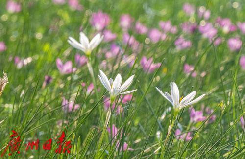 东山湖公园,白色的葱莲和粉红色的韭莲在阳光照耀下。