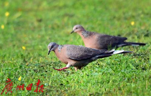 东山湖公园,两只珠颈斑鸠在草地上觅食。