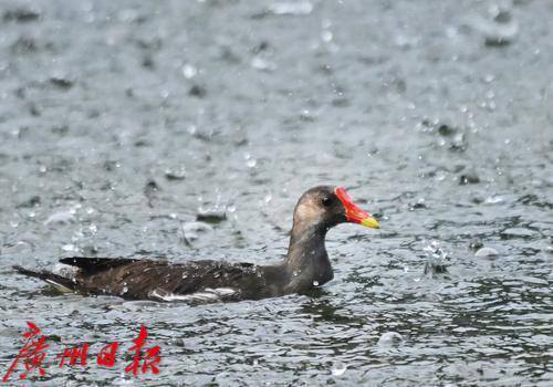 中午时分,一场大雨来袭,广州起义烈士陵园池塘中的黑水鸡在雨中游弋。