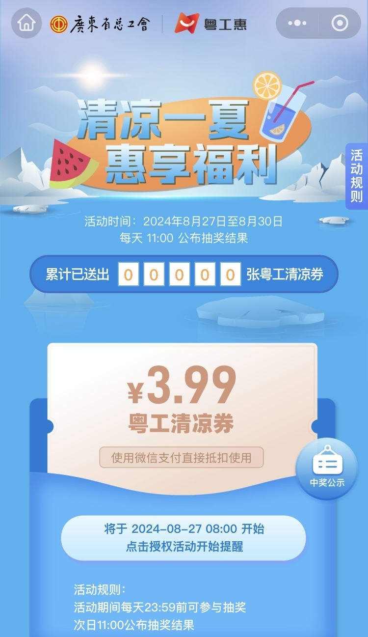 活动于8月27日8:00 至8月30日23:59开展。活动期间,每天发放“清凉券”6250 张,全省粤工惠实名会员不限行业,每天23:59前均可参与抽奖。职工朋友可从“粤工惠”小程序、“粤工惠”App 进入活动页面。