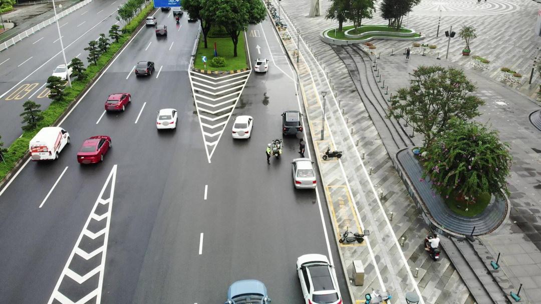 “禅城交警提醒您,请使用交管12123APP进行视频快处,在操作前请打开车辆危险报警闪光灯,并在车辆后方50-100米处摆放三角警示牌,处理完毕后立刻将车辆挪离事故现场。”坐镇指挥大厅的禅城警航队员迅速拿起麦克风,通过机身挂载的高功率扩音设备,向还在现场的双方驾驶员喊话引导。双方车主按指引摆放三角警示牌,站在安全位置使用视频快处功能对事故现场进行拍照。很快,指挥大厅调度的交警铁骑赶到事故现场,指引事故双方将车辆驶到路边,并疏导过路车辆快速通过,至此交通拥堵问题得以缓解。