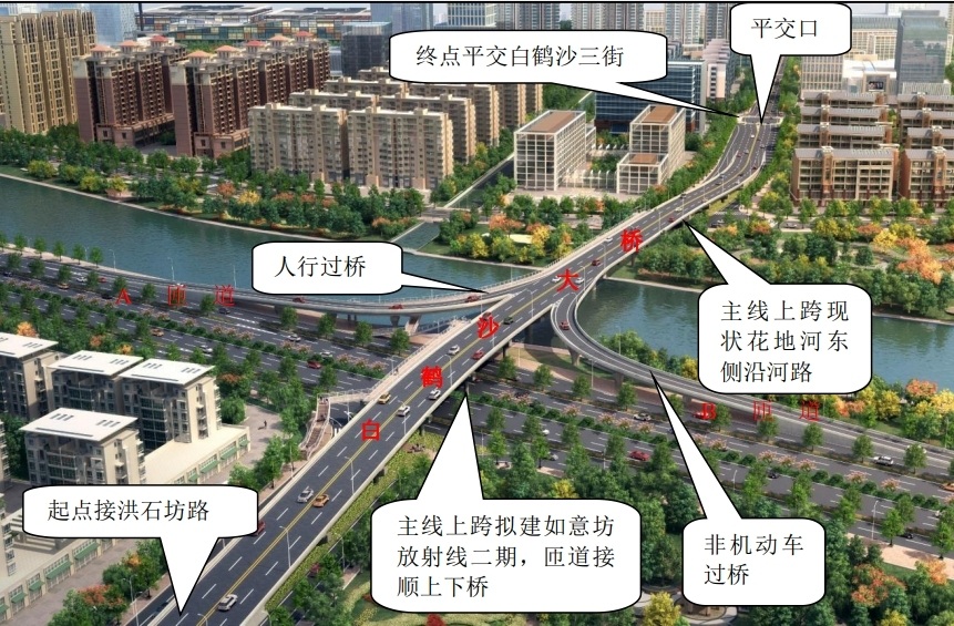 项目采用跨河大桥方案,跨越如意大道花地河东岸路,主线上跨花地河,接洪石坊路,设置上下匝道连接如意坊放射线,路线总长 770米,其中桥梁长度 465米。主线设计为城市次干路,双向四车道,设计车速 40公里/小时;匝道为单车道、设计速度 30公里/小时。