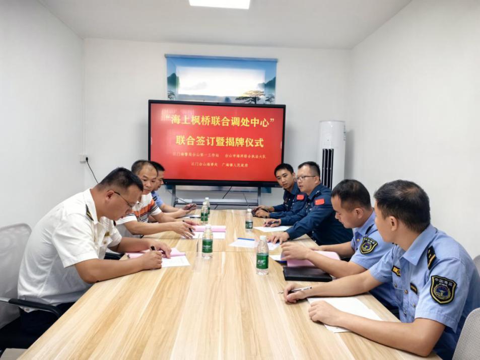 当日,工作站、海事、海综与当地政府就海上矛盾纠纷作经验交流,分享了在各自领域处置海上矛盾纠纷好的做法,签署了《关于成立台山海上枫桥联合调处中心的方案》,完善了《联合调处中心人员信息及通联表》,共同为“联合调处中心”揭牌。