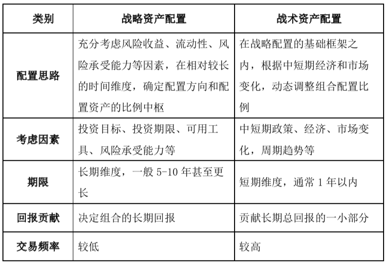 资产配置也分作战略、战术两个层次,二者的着眼点、立足点、基本理念、流程方法都有差异,实践中若能有机结合、综合应用,对提升配置组合长期收益,控制潜在风险都大有好处。