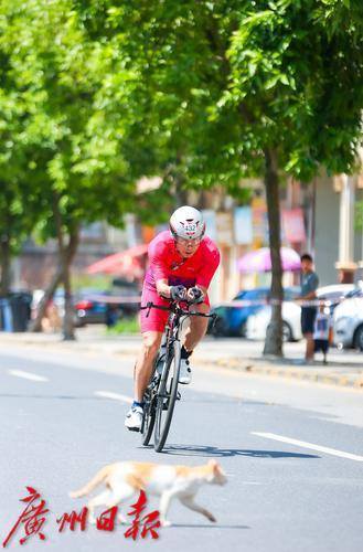 自行车赛道全程封路,一只瞅到空隙过路的小猫被摄影师摄入了镜头。