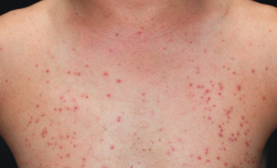 特点:一般呈半球形毛囊性丘疹,有光泽,周边有红晕,间杂着小脓包,好发于肩背、颈肩等皮脂腺丰富的部位,可能伴有瘙痒、疼痛。