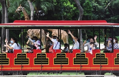 游客乘坐小火车在广州长隆野生动物世界自驾游览区游玩。记者 刘大伟 摄