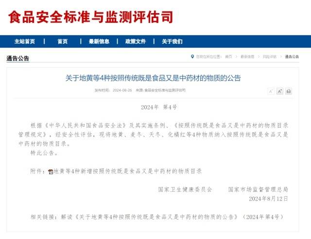 8月26日,国家卫生健康委员会、国家市场监督管理总局发布《关于地黄等4种按照传统既是食品又是中药材的物质的公告》(以下简称《公告》),《公告》表示,根据《中华人民共和国食品安全法》及其实施条例、《按照传统既是食品又是中药材的物质目录管理规定》,经安全性评估,现将地黄、麦冬、天冬、化橘红等4种物质纳入按照传统既是食品又是中药材的物质目录。