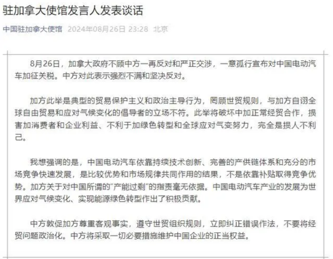中国驻加拿大使馆发言人表示,8月26日,加拿大政府不顾中方一再反对和严正交涉,一意孤行宣布对中国电动汽车加征关税。中方对此表示强烈不满和坚决反对。