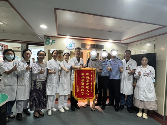 患者出院后,派出所相关人员及患者家属给救治团队送上锦旗。