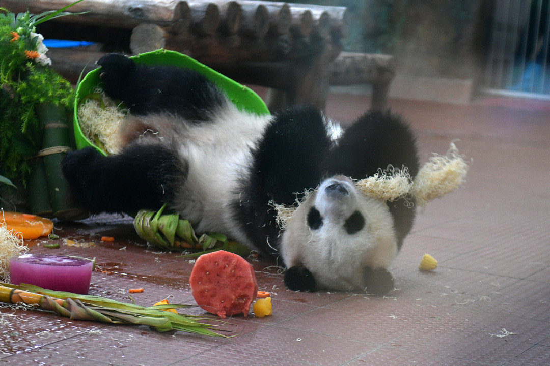 大熊猫保育员龙绮茜告诉记者,熊猫的11岁大致相当于人类的30岁左右。她介绍说,今天准备的水果、蔬菜等不一样的食物,可以起到丰容的作用,给它们一种新的刺激,减少兄妹俩刻板行为的发生。龙绮茜透露,生日会上的菜花、辣椒等蔬果,兄妹俩其实大部分不会去吃,“它们的食物还是比较单一的,‘星一’比较爱吃苹果,对其他水果它都是不会去尝试。‘雅一’会对比较甜的水果,像西瓜、青提子这些感兴趣一点。”