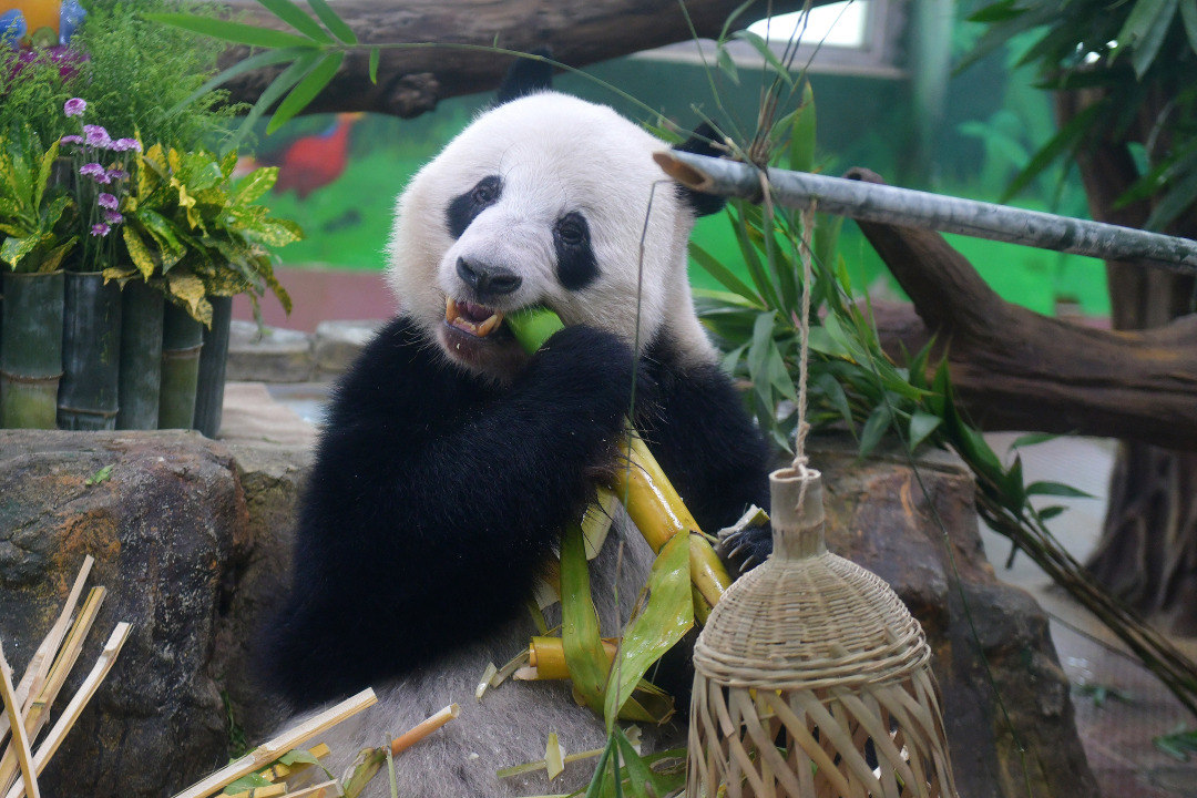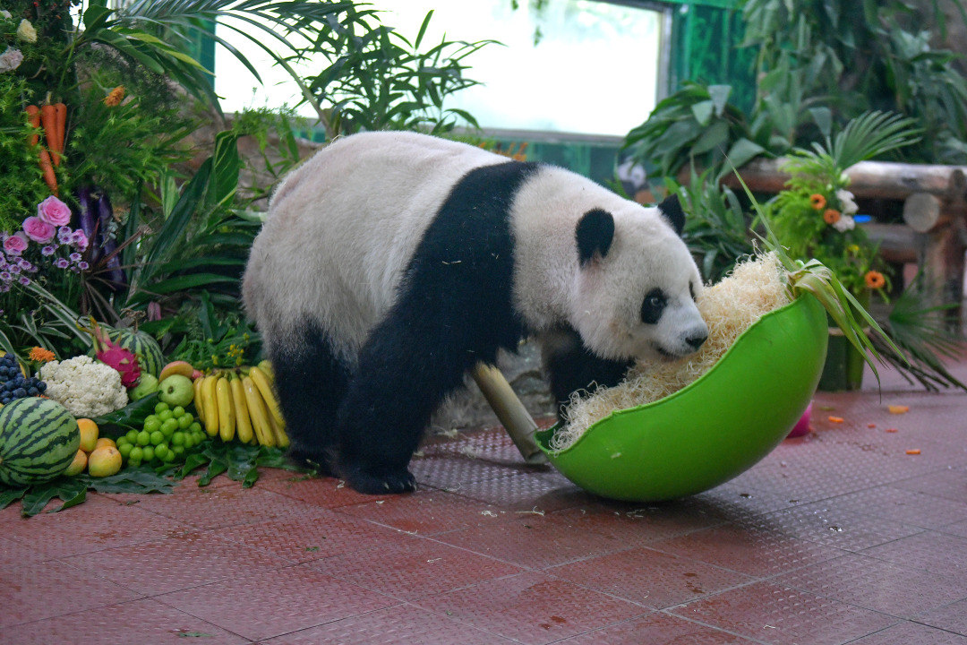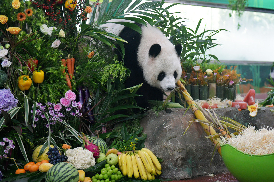 9时左右,“星一”“雅一”开始享用它们的生日大餐。“星一”首先注意到海星,好奇嗅闻后迅速转向竹子,恢复“干饭王”姿态,一边吃饭一边拨弄风铃。“雅一”一登场马上奔向最爱的刨花,搓头、擦身、翻滚,舒服地给自己做了个“全身按摩”,沉浸之余不小心碰倒蛋糕,引起一片惊呼。随后,“雅一”走向画有自己画像的竹筛,毫不费力取下用嘴衔住,充分展现“瑜伽女王”的实力。